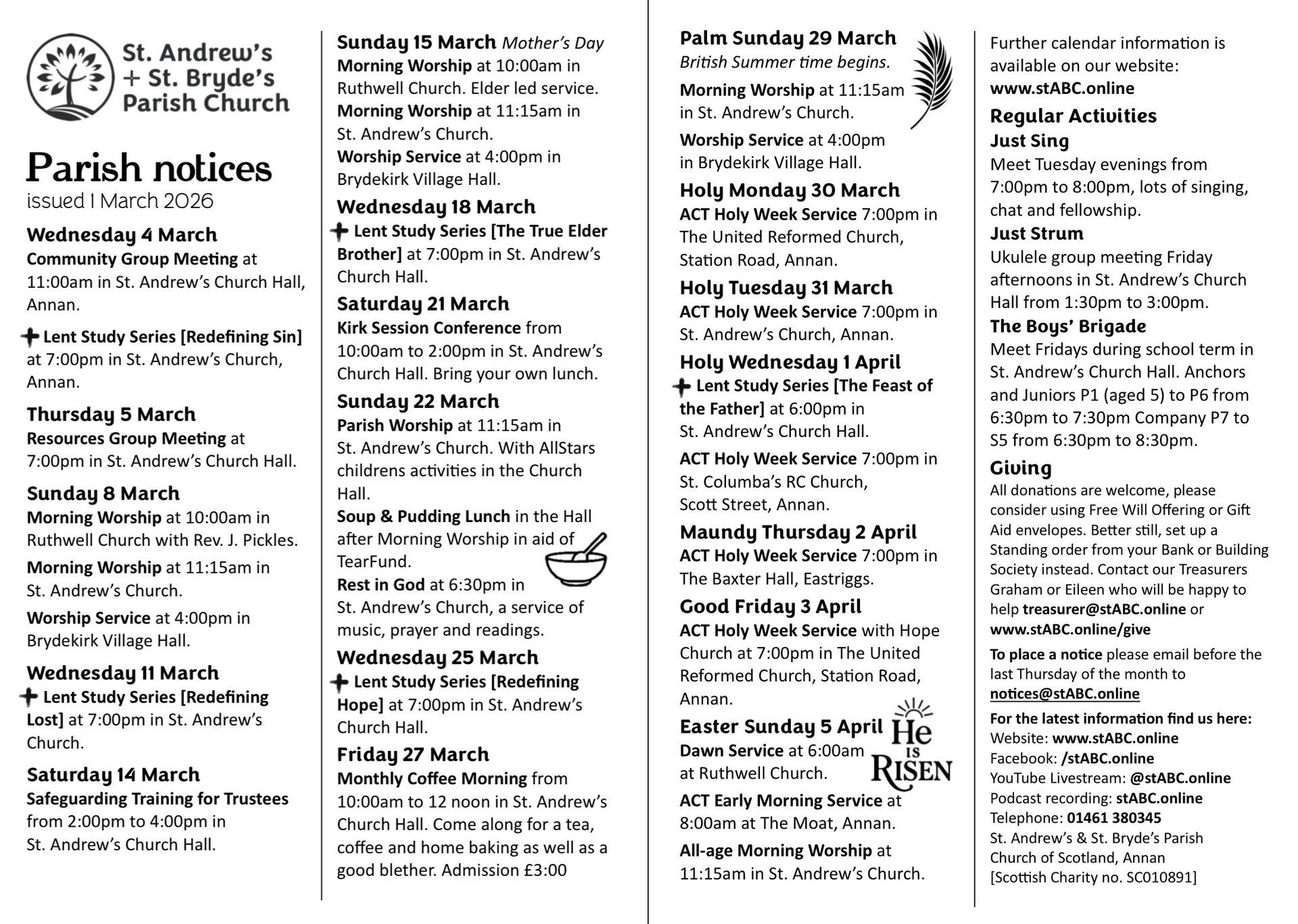 St. Andrew's Church, Annan at 11:15am and Brydekirk Village Hall at 4:00pm. Ruthwell Church service details are in the calendar. If you aren't ready to join us in-person we have a number of ways you can connect with us from home.
