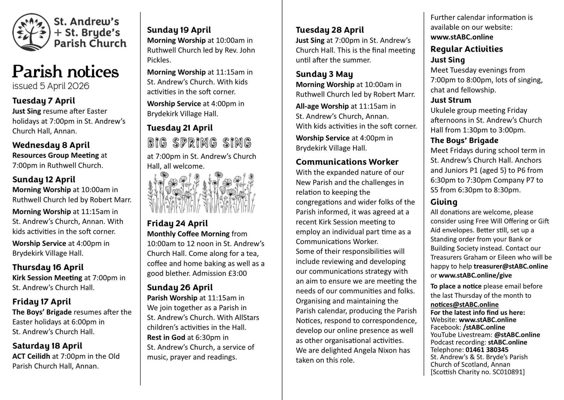 We are St. Andrew's & St. Bryde's Parish Church of Scotland serving communities in and around Annan, Brydekirk, Carrutherstown, Clarencefield, Cummertrees, Dalton, Hightae, Mouswald, Newbie, Powfoot and Ruthwell in the county of Dumfries & Galloway.